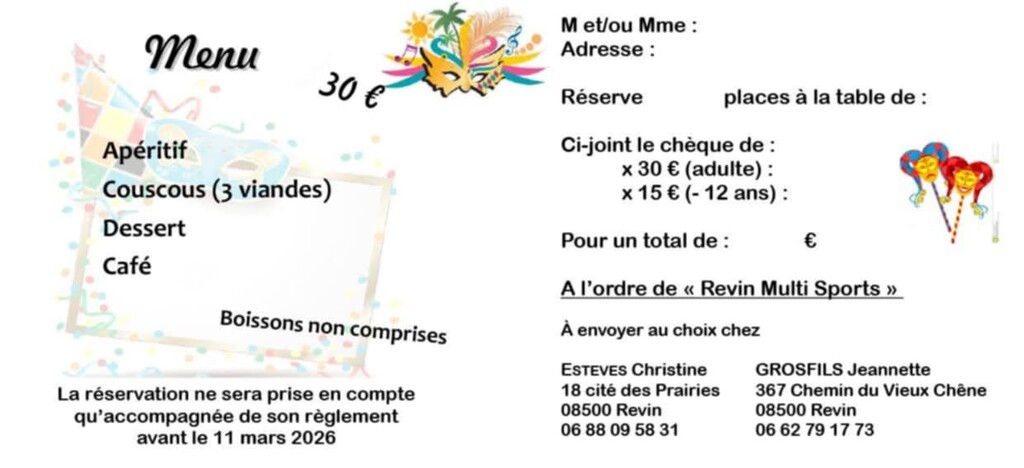 Les inscriptions et réservations avec le règlement sont à faire avant le 12 Mars au 06.62.79.17.73 ou 06.88.09.58.31